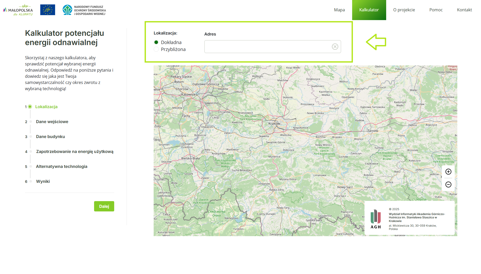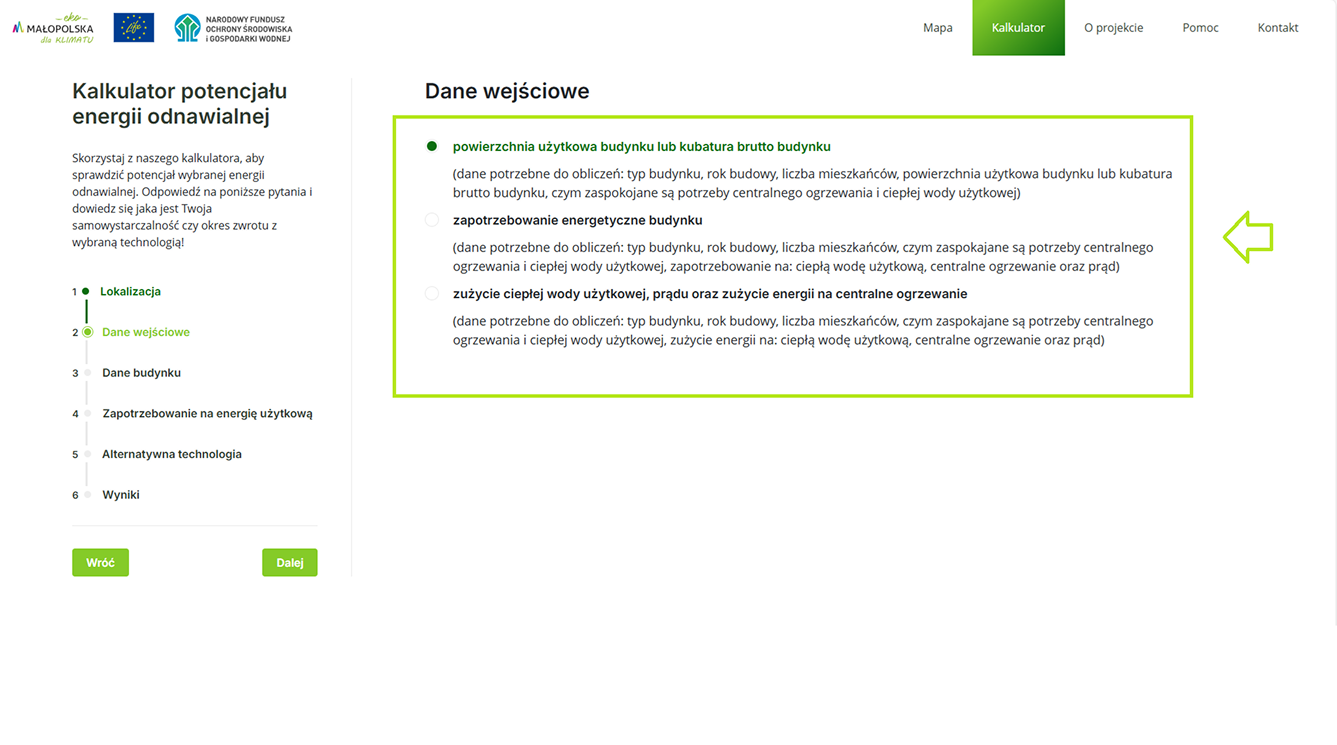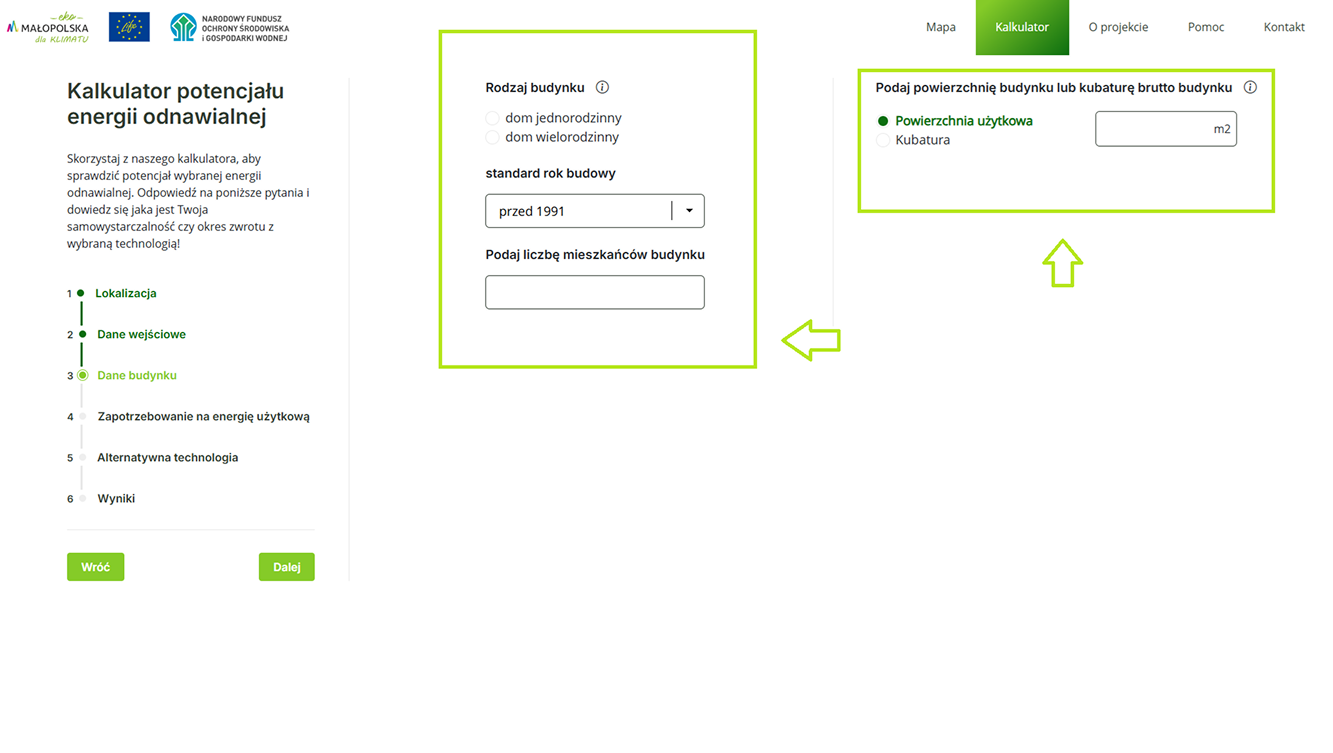 W tym kroku automatycznie wczytywane są dane dotyczące wybranej lokalizacji na mapie lub sam użytkownik może je wprowadzić. Użytkownik widzi m.in.:Możesz samodzielnie wprowadzić dokładną powierzchnię użytkową i kubaturę budynku w następnym kroku.