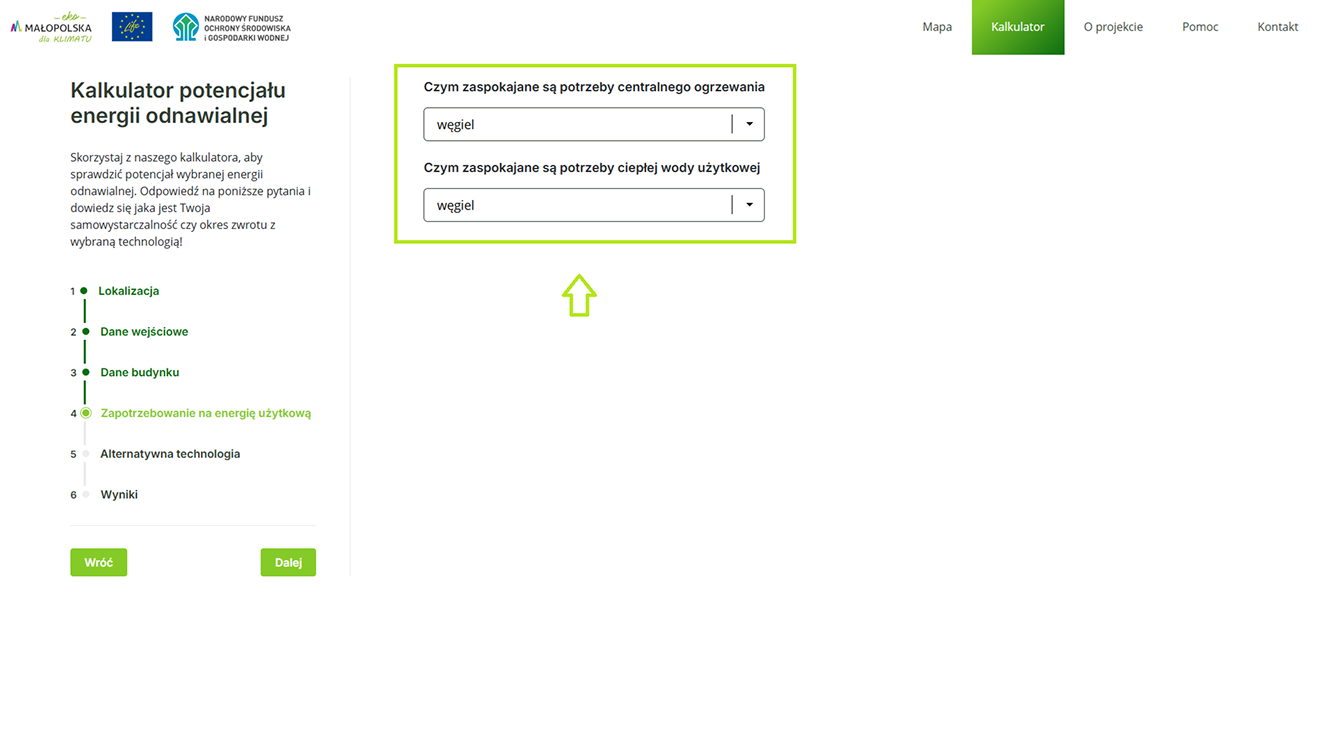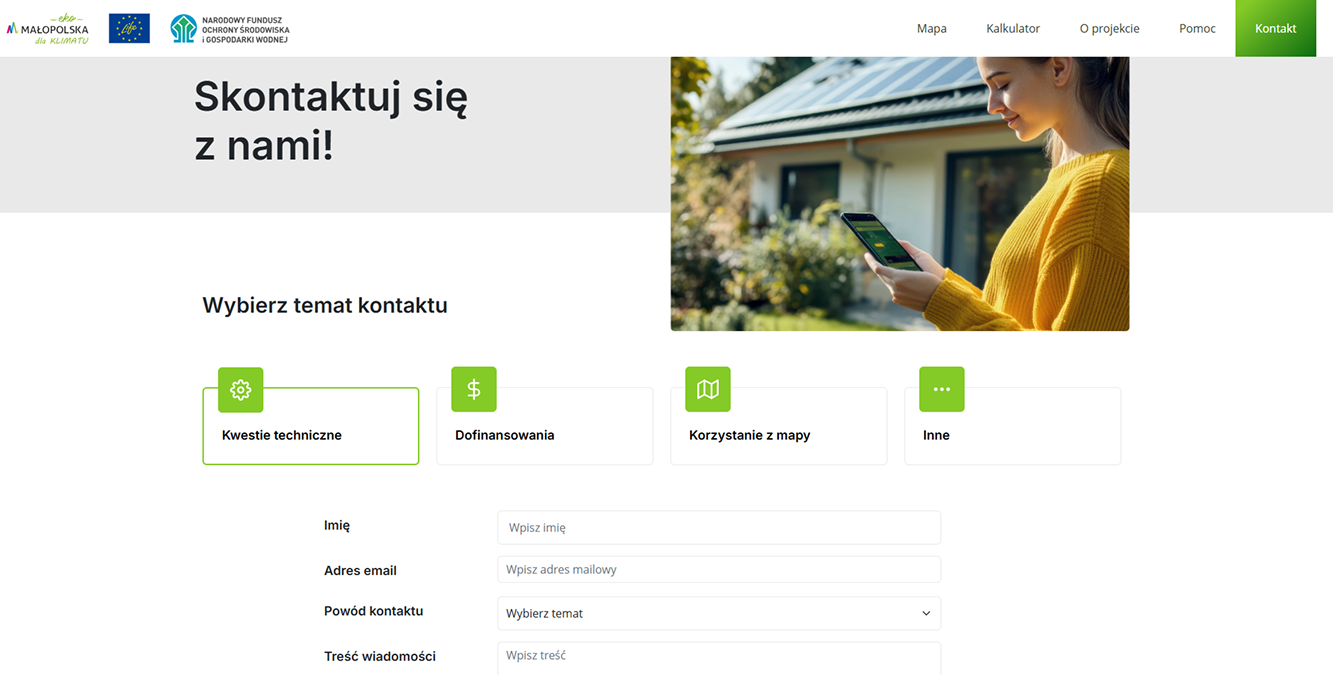 Mapa, Kalkulator, O projekcie, Pomoc, Kontakt