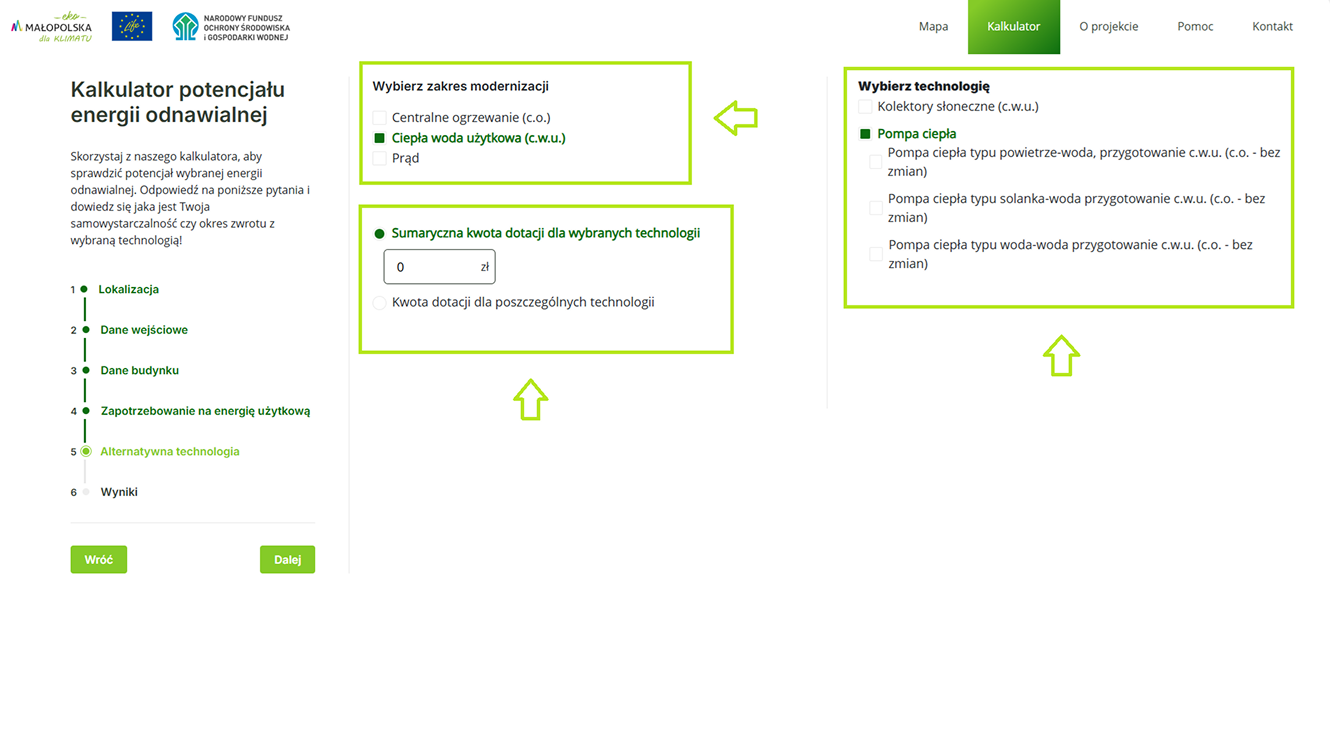 Strona Kalkulator - daje możliwość obliczenia, czy opłaca się przejść na ekologiczne źródło energii.